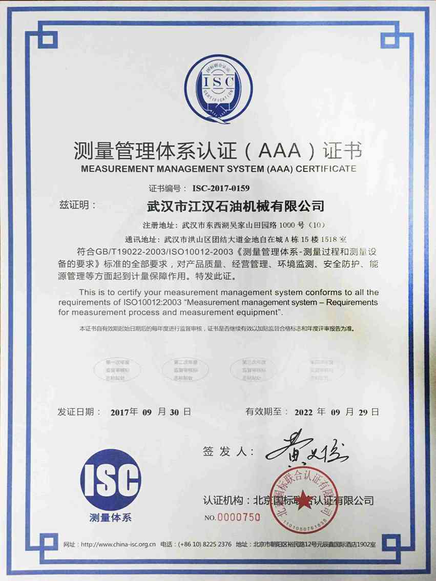• 測量管理體系證書
